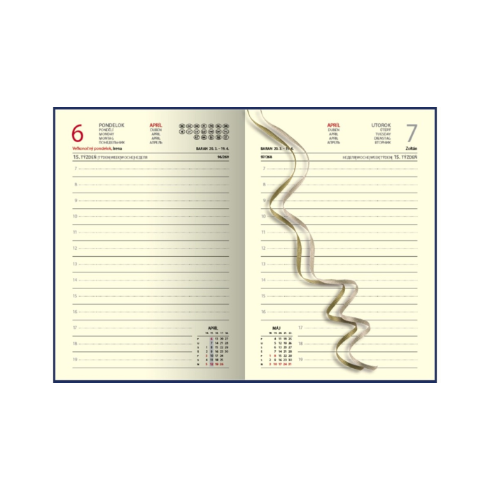 Luxusný denný diár z ekologickej kože s prehľadným kalendáriom na každý deň. Diár je v pevnej väzbe s prednou aj zadnou penovou doskou, doplnený ozdobným prešitím po obvode diára, strieborným plieškom s rokom a dvoma lacetkami. Obsahuje slovenské kalendárium.