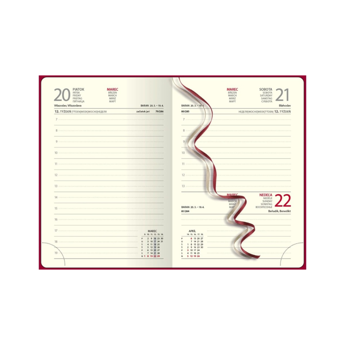 Jedinečný denný diár potiahnutý kvalitným termocitlivým poťahom. Diár je v pevnej väzbe s prednou penovou doskou, farebnou gumičkou, pútkom na pero a praktickým vreckom. Slovenské prehľadné kalendárium.