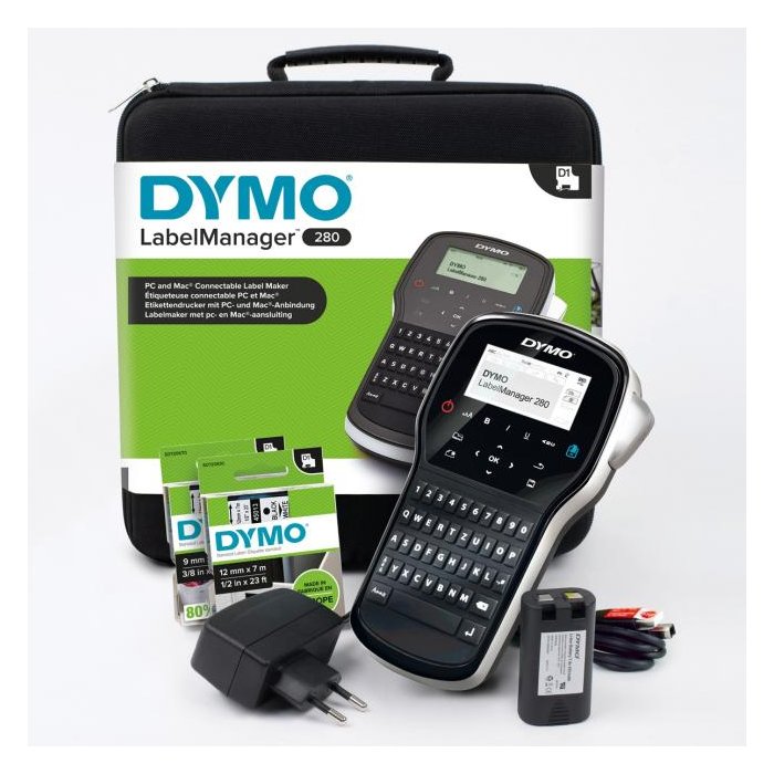funkcia automatického vypínania. Technické parametre: 2-riadkový 13-znakový semi-grafický displej, slovenská diakritika, QWERTY klávesnica, 222 symbolov a obrázkov, 8 druhov rámčekov, 3 fonty, 7 štýlov písma,6 veľkostí písma, funkcia uloženia textu, pamäť na uloženie posledných 9 štítkov, ručný odstrih pásky, USB pripojenie. Balenie obsahuje: štítkovač LabelManager 280, Nabíjateľná batéria, USB kábel, Štartovacia kazeta na štítky D1, čierna na bielej, 12 mm x 3 m, Karta rýchleho spustenia, Nabíjací adaptér.