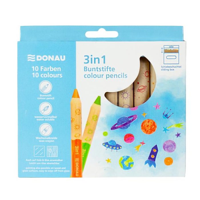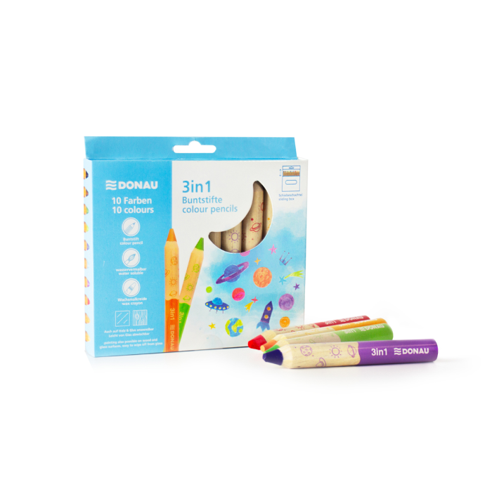 Sada 10 hrubých, stredne dlhých farbičiek, 3 v 1 - perfektná kombinácia farebnej ceruzky, akvarelu a pastelky v jednom. Každá ceruzka má extra veľkú tuhu, ktorá zaručuje výnimočné krytie a intenzívne farby, a to aj na tmavom papieri, dreve alebo skle. Farba tela ladí s tuhou, čo uľahčuje výber správnej farby. Vďaka svojej praktickej veľkosti (Ø 15 x D 100 mm) sa ceruzky pohodlne držia a sú ideálne pre deti aj dospelých. Sada sa dodáva v praktickej posuvnej krabičke s otvorom na zavesenie v európskom štýle, ktorá je vhodná na skladovanie aj na vystavenie v maloobchode.