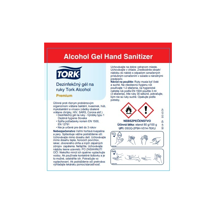 Tork Alcohol gélový dezinfekčný prostriedok s 80 % obsahom denaturovaného liehu efektívne ničí mikroorganizmy a pomáha tak predísť šíreniu infekcií. Efektívny voči rôznym organizmom vrátane obalených vírusov, norovírusov a rotavírusov. Ideálny na každodennú hygienu rúk aj v zdravotníctve. Vhodné na použitie s Tork zásobníkom na mydlá a dezinfekčné prostriedky (S4).