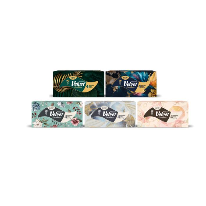 Elegancia, luxus a extra starostlivosť je ukrytá v novinke Velvet Excellence. 90 ks jedinečných, štvorvrstvových kozmetických obrúskov, ktoré sú výnimočne delikátne, napriek tomu dostatočne pevné. Vreckovky ponúkajú extra starostlivosť o pleť a nadčasové, prémiové designy. 4 vrstvy, 90 útržkov, 100% celulóza