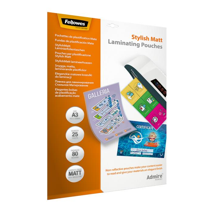 Kreatívne laminovacie fólie. Fólie Stylish Matt s nereflexnou matnou úpravou, ktorá uľahčuje čítanie zalaminovaného dokumentu a dodáva mu elegantný vzhľad. Laminovaanie za tepla, hrúbka 80 mic.. Formát A3. Balenie 25 ks.