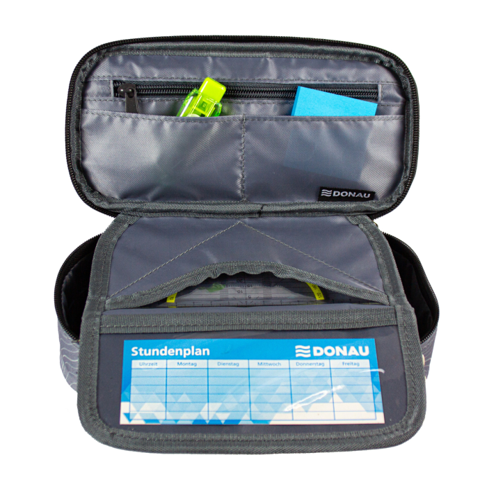 Peračník vyrobený z odolného polyesteru so zipsom. Vo vnútri sa nachádza priehradka na zips a dve praktické vrecká. Vnútorná chlopňa ponúka vrecko na štvorec a priehľadné okienko na rozvrh. Desať pútok na perá udrží veci poriadok. Peračník je prázdny.
