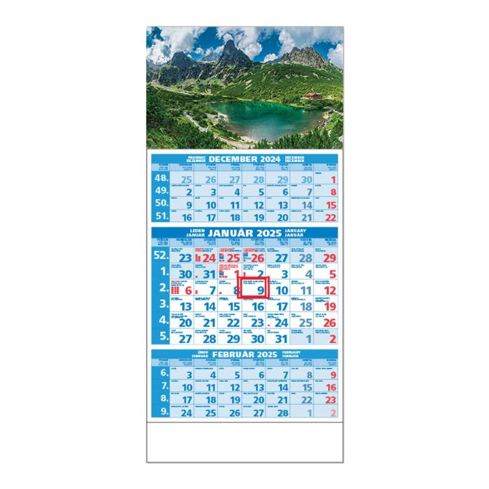 Plánovací 3-mesačný modrý kalendár s priloženou hornou čistou lištou, s menami v SK + CZ, názvy mesiacov a dní v SK, CZ, UK, DE a HU.