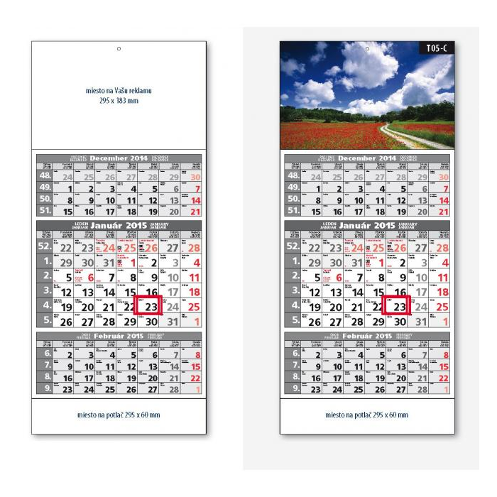 Plánovací kalendár štandard 3-mesačný, sivý s obrázkom. Rozmer : 295x663 mm. Väzba šitá s perforáciou. Názvy mesiacov v SK, CZ. UH, DE, HU. Balenie 50 kusov.