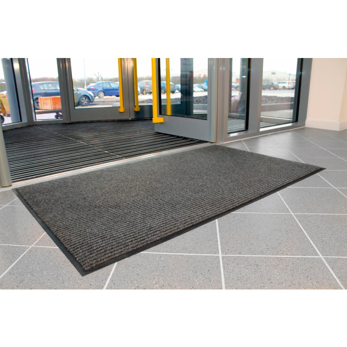 Vstupná rohož s rebrovaným povrchom, ktorý je určený pre náročné vstupné zóny. Vytvára „kanáliky“ na zachytenie špiny a nečistôt a vysušuje vlhkosť z podrážok, čím zvyšuje bezpečnosť chôdze na hladkej podlahe. Vhodná do vstupných priestorov, hál a chodieb. Vlas zo 100% polypropylénu, spodná strana rohože z PVC s ochranou proti znečisteniu a pošmyknutiu. Výška 9 mm. Trieda horľavosti podľa európskej normy EN 13501-1. Rozmery 60 x 90 cm. Farba sivá.