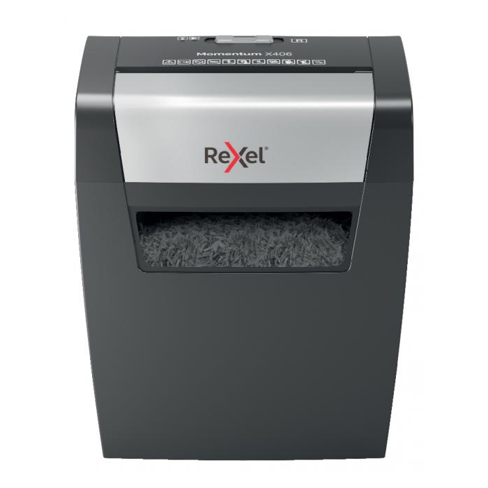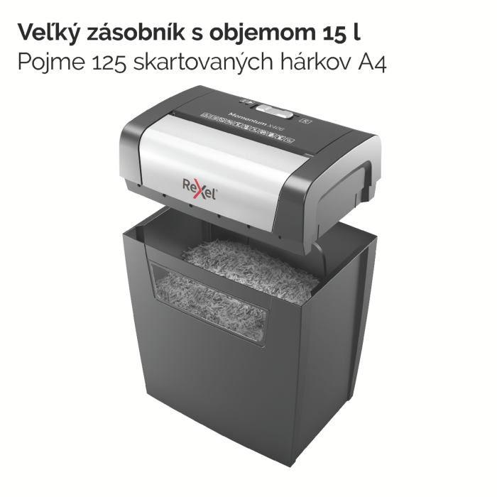 Nezastaviteľná skartovačka! Rexel Momentum X406 skartuje až 6 hárkov naraz a vydrží v nepretržitom chode 3 minúty, vhodná na použitie doma. Krížový rez na úrovni zabezpečenia P4 reže papier na malé časti s veľkosťou 4 × 28 mm. Odpadový kôš s kapacitou 15 l pojme 125 hárkov A4.