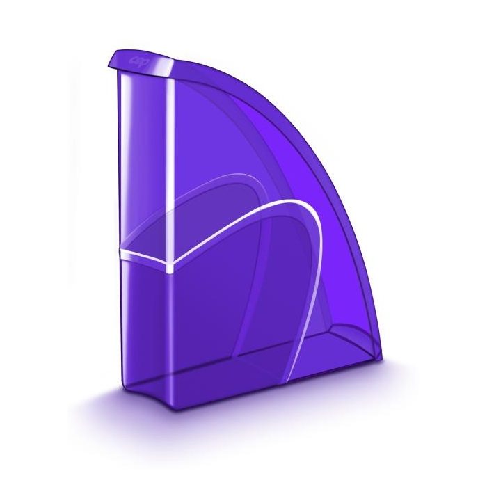 Stojan na časopisy s možnosťou vertikálneho alebo horizontálneho postavenia má elegantné línie, zvýraznené materiálom s kontrastným matným povrchom na hladkom pozadí. Vhodný na dokumenty do veľkosti 24 × 32 cm. Kapacita 700 listov (80 g / m²), rozmery 270 × 85 × 310 mm. Materiál 100% recyklovateľný vysokokvalitný plast. Väčšie balenie 10 ks. Farba transparentná fialová.