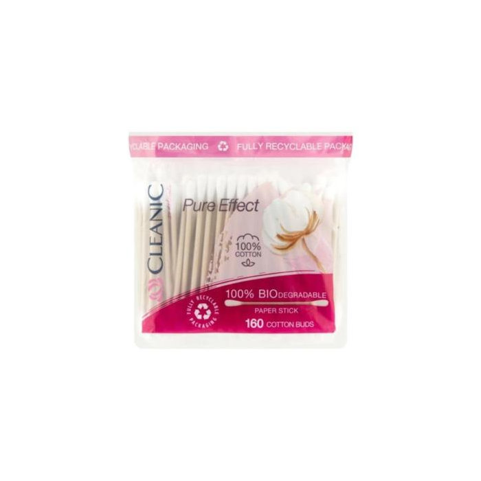 VATOVÉ TYČINKY CLEANIC PURE EFFECT BIO 160 ks -náhradné balenie. Nepostrádateľné pre každodenné hygienické a kozmetické ošetrenie. Hlava tyčinky je vyrobená zo 100% kvalitnej bavlny. Tyčinka vyrobená z papiera z cukrovej trstiny je 100% biologicky odbúrateľná. Z dôvodu ochrany životného prostredia sú obaly tyčiniek vyrobené z plne recyklovateľných materiálov.