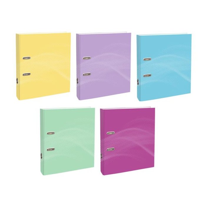 5 rôznych pastelových farieb, do školy, domácej kancelárie alebo kancelárie. S priestorovo úspornými krúžkovými zošitmi (Rado), šírka chrbta 70 mm, pre formát DIN A4 a pákovým mechanizmom. Laminovaný papierový povrch s lesklou lamináciou a otvorom na prst.