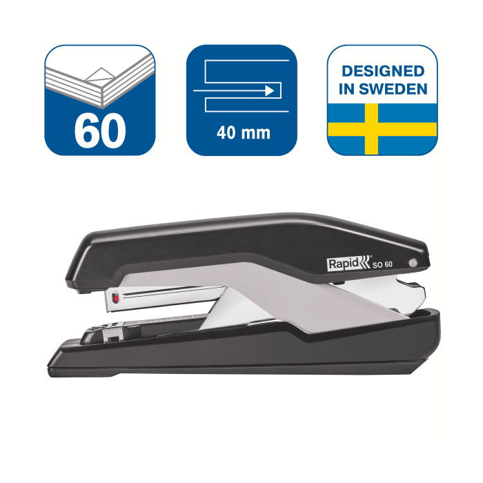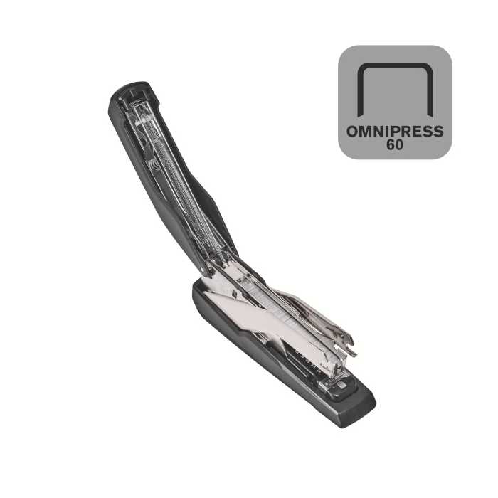 Revolučná zošívačka kompaktných rozmerov a s klasickou kapacitou zásobníka, vybavená patentovanou technológiou Omnipress®, ktorá umožňuje s minimom sily stlačiť zošívačku po celom jej tele a ľahko tak zošiť dokument na stole i v ruke. To všetko v kombinácii s technológiou super plochého zošívania SuperFlatClinch prinášajúcou 40 % úsporu miesta pri zakladaní takto zošitých dokumentov. Farba čierna/sivá. Kapacita zošívania až 60 listov.